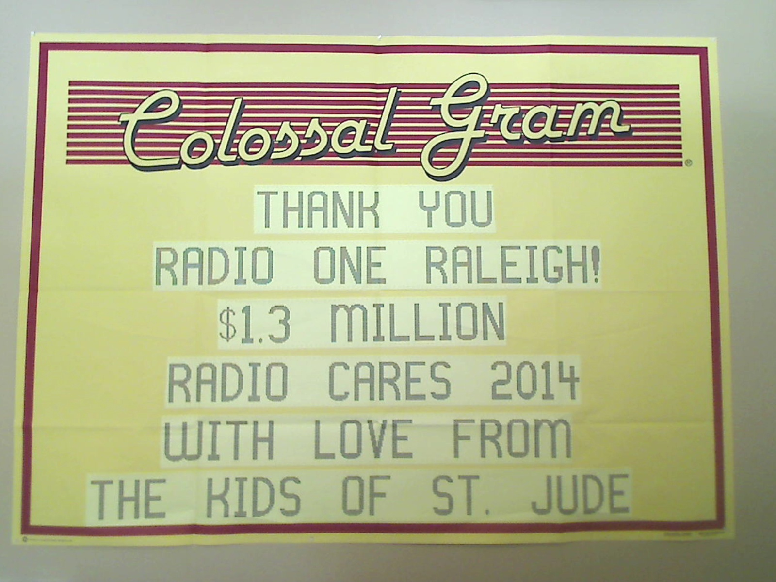 Here’s the Colossal Gram that St. Jude sent us and we want to share it with you because we did this together!!!! Text “LIGHT” To 37890 for your chance at ticket giveaways and news before anyone else!…Standard Messaging Rates Apply The Light 103.9 thanks you for your contribution toward the 2014 St. Jude Children’s Research […]